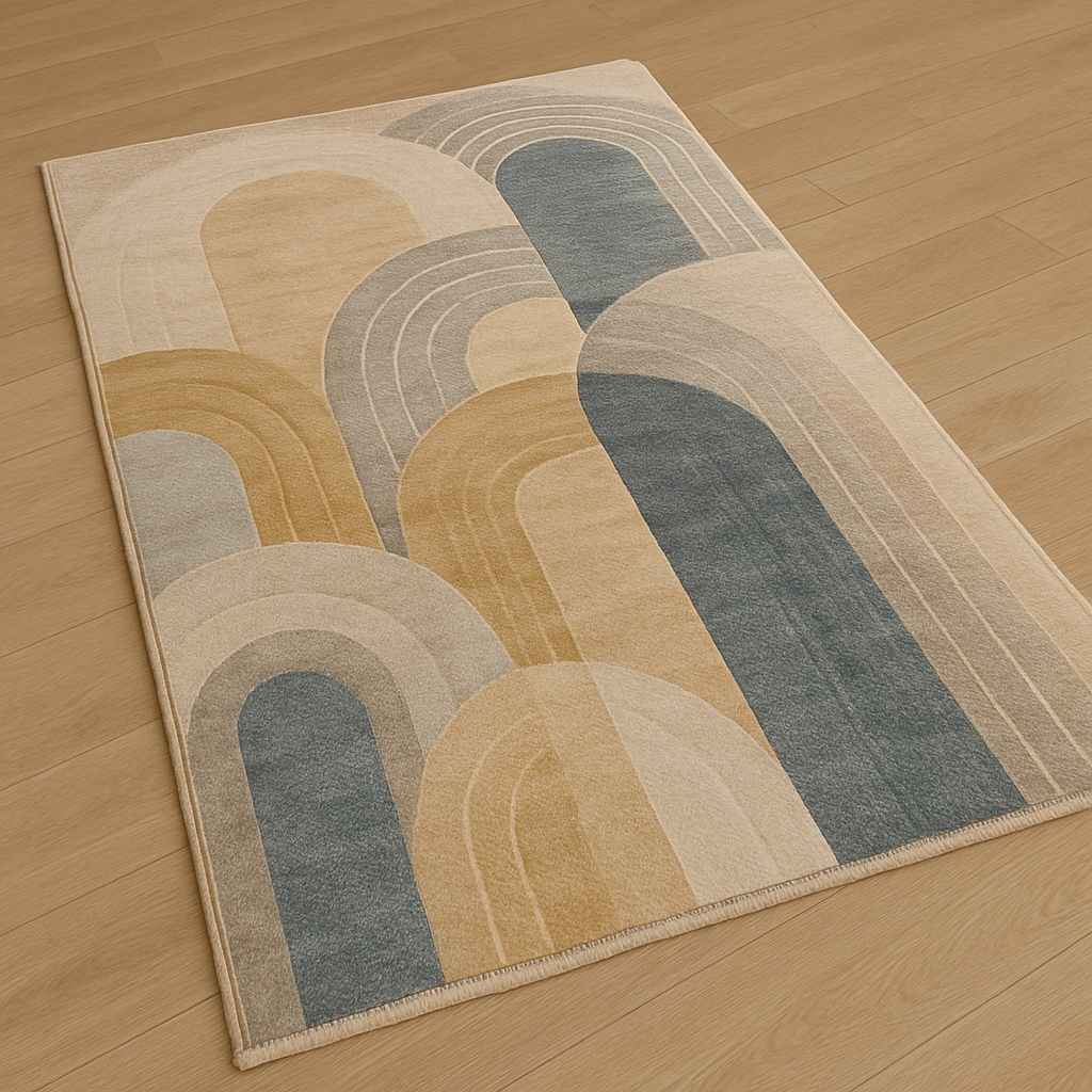تتميز هذه السجادة العصرية بنقوش أقواس متداخلة وبألوان هادئة مثل الأزرق الرمادي، البيج، والذهبي المعتّق. إنها ليست просто قطعة ديكور، بل هي تجسيد للرقي والراحة، مما يجعلها الخيار المثالي لأي غرفة جلوس ترغب في أن تضيف لها لمسة عصرية وموافقة.