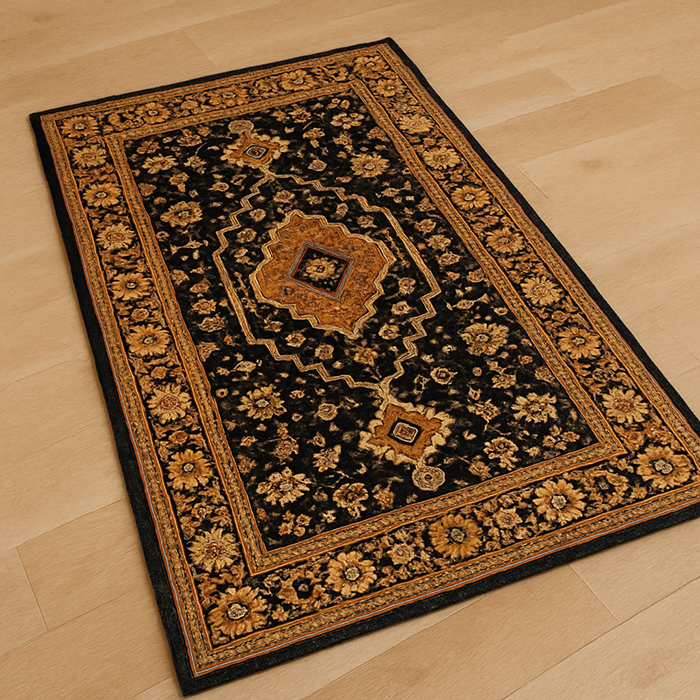 تمتاز سجادتنا بأرضية سوداء تجذب الأنظار، مزينة بإطار ذهبي غني يحد من جمال التصميم. الألوان المتنوعة التي تشمل البرتقالي والنحاسي والبيج تضيف عمقًا وجاذبية، مما يضمن أن تكون هذه السجادة محور اهتمام في كل غرفة. ستجد أن التباين بين الألوان يُبرز جمال السجادة بطريقة لا مثيل لها.