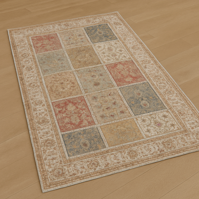 تقدم لك سجادة مميزة بنمط رقعات (Patchwork) كلاسيكي، التي تعد خيارًا مثالياً لإضافة لمسة فريدة إلى منزلك. تتكون هذه السجادة من مربعات متجاورة بألوان متناغمة مثل الأحمر، الأزرق، الذهبي، والبيج، مما يجعلها تتناسب مع مختلف أنماط الديكور. دع كل زاوية من زوايا منزلك تنبض بالحياة والألوان مع هذه السجادة الرائعة.